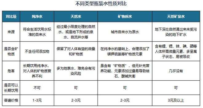 瓶装水是一种密封于符合食品安全标准和相关规定的瓶装容器中,可供直接饮用的水,用于个人使用和零售★◆。按照来源和成分划分,瓶装水主要分为四类:纯净水■◆★■◆、天然水◆■、矿物质水和天然矿泉水◆■■◆★◆。纯净水简称净水或纯水★◆,指不含杂质的水★★,是来源于符合生活饮用水卫生标准的自来水★◆■◆;天然水是经过最小限度处理的自然水★◆◆,或者是地下形成的泉水■★◆、自流井水等★■◆★■■;矿物质水是在纯净水的基础上,合理添加镁钾硫氯等矿物质元素;天然矿泉水是从地下深处自然涌出来未受污染的地下矿水◆■■,通常含有独特化学以及物理特性。
